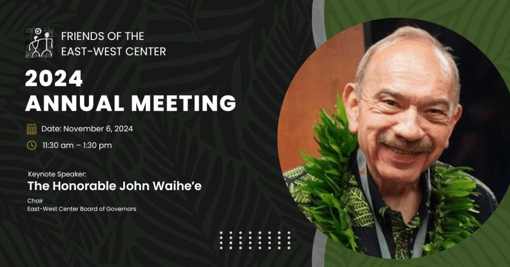 You are cordially invited to the 2024 Friends of the East-West Center Annual Meeting featuring keynote speaker, The Honorable John Waiheʻe, former Governor of the State of Hawaiʻi and Chair of the East-West Center Board of Governors.