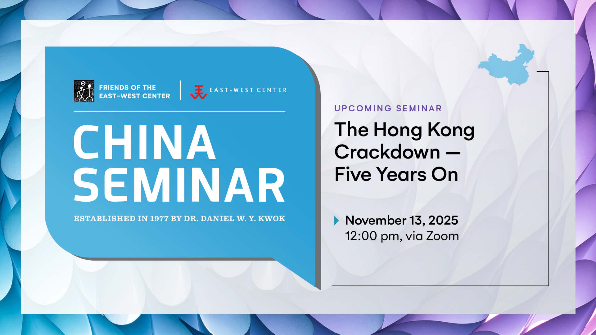 The China Seminar was founded by Dr. Daniel W.Y. Kwok in 1977. Under his guidance, it became a signature program of the Friends of the East-West Center (FEWC) in 2009. The program provides an informal venue for China experts, such as scholars, diplomats, and journalists, to present talks on aspects of China that interest the community and members of the Friends. Topics include politics, economics, social issues, history, culture, food, arts, and many other subjects.