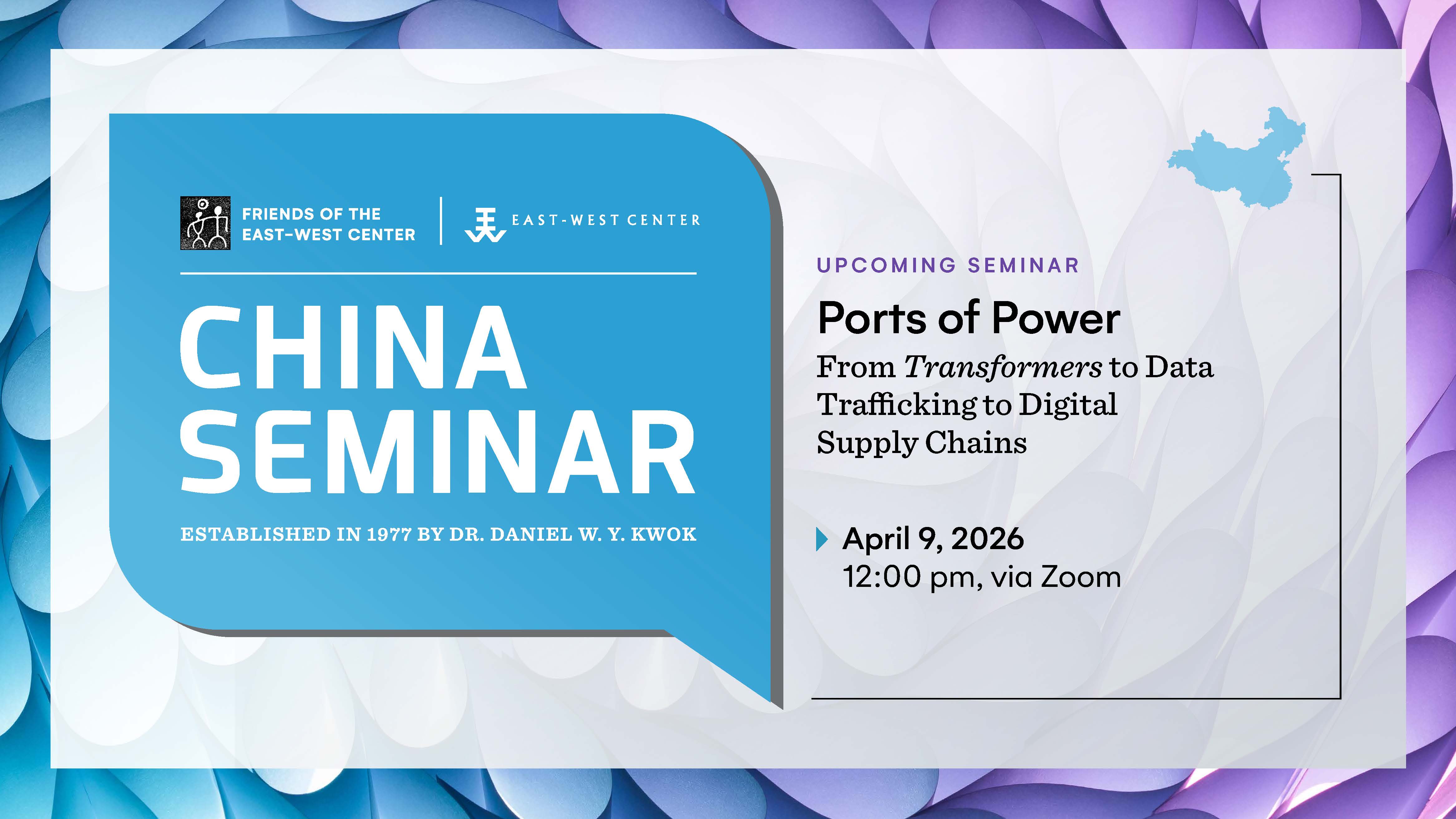 The China Seminar was founded by Dr. Daniel W.Y. Kwok in 1977. Under his guidance, it became a signature program of the Friends of the East-West Center (FEWC) in 2009. The program provides an informal venue for China experts, such as scholars, diplomats, and journalists, to present talks on aspects of China that interest the community and members of the Friends. Topics include politics, economics, social issues, history, culture, food, arts, and many other subjects.